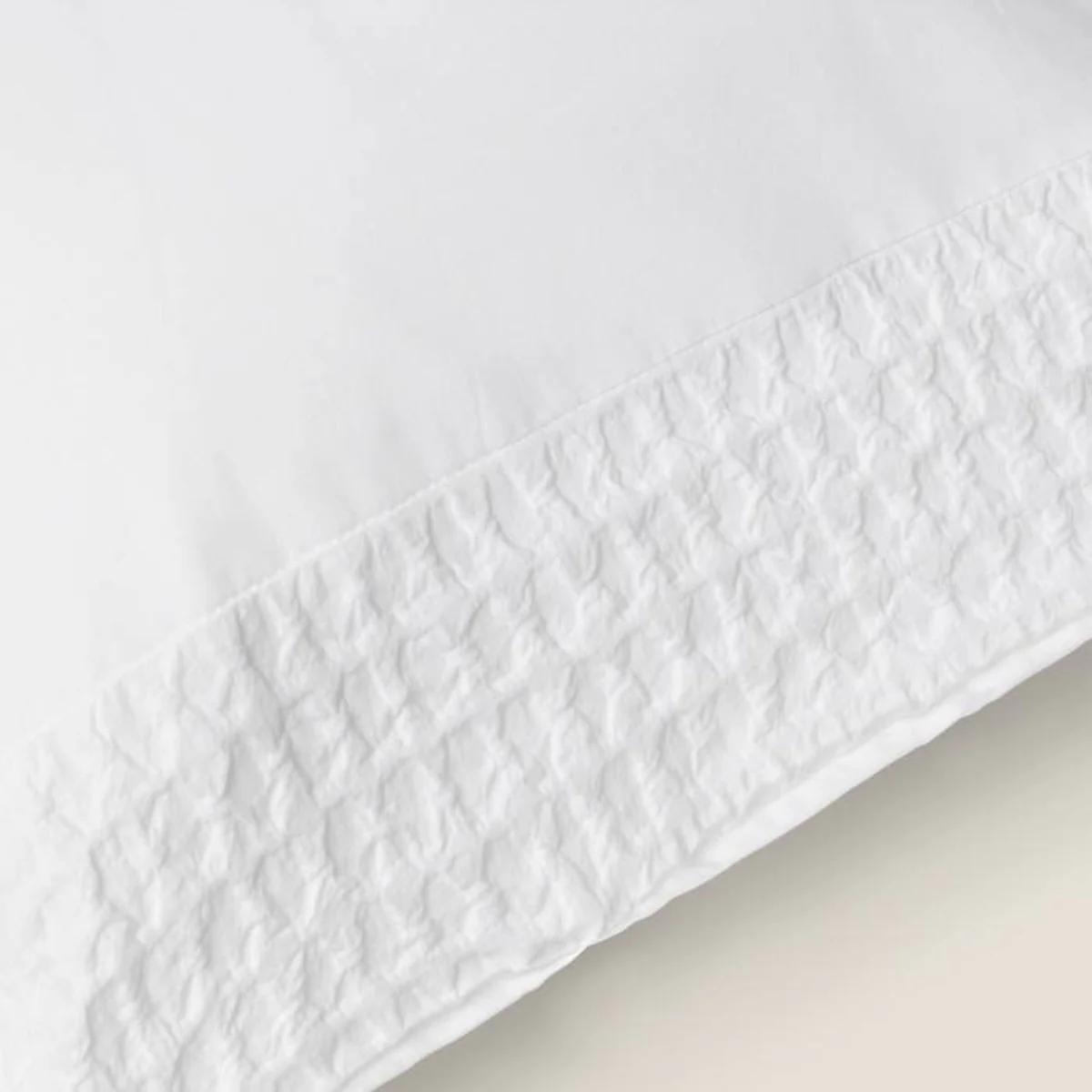 Funda de almohada de algodón con aplique de tejido seersucker efecto panal en el extremo. Se cierra con solapa. La medida 50x75 cm incluye dos unidades.