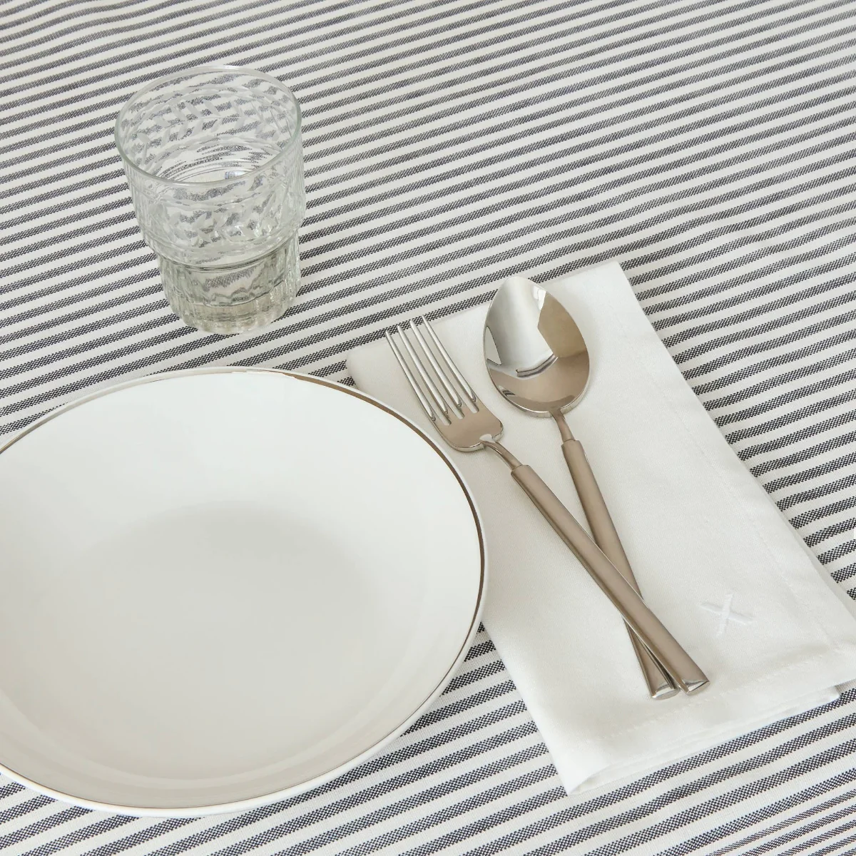 Mantel con estampado de finas rayas y tratamiento antimanchas resinado. Práctico y moderno, ideal para el uso diario y fácil de combinar con cualquier decoración.