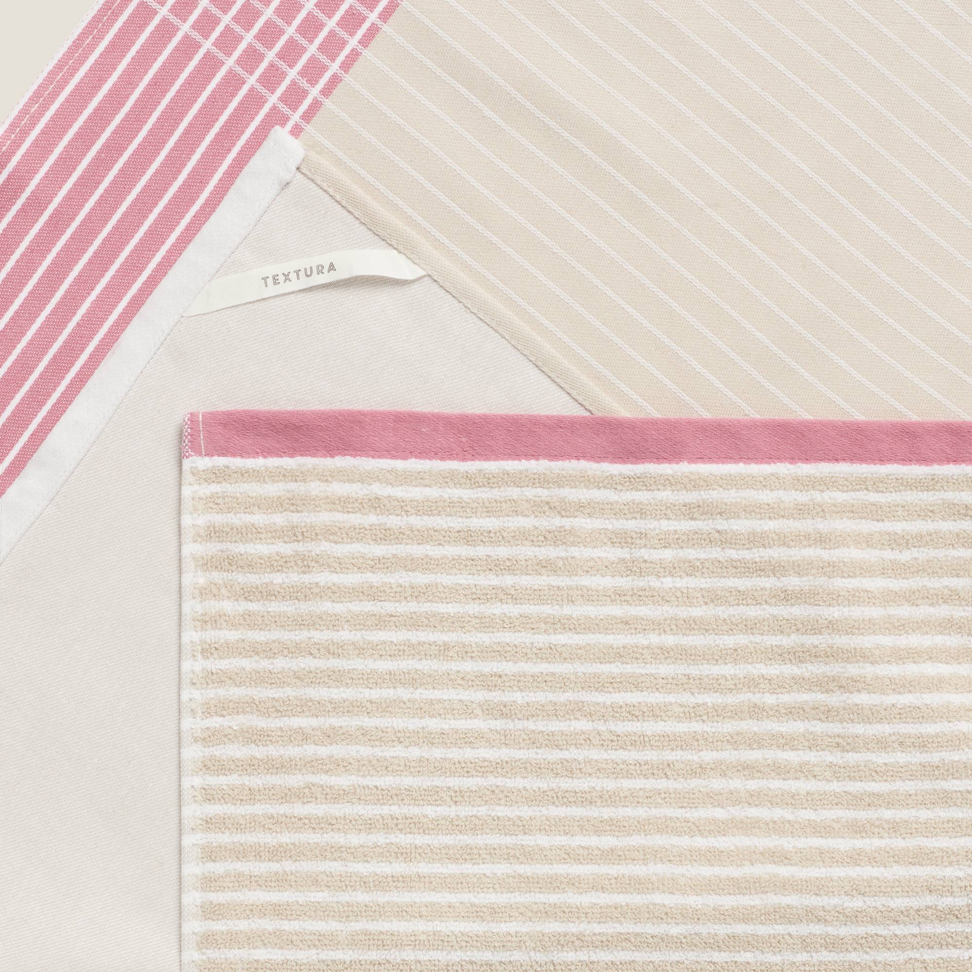 Set de dos trapos de cocina, uno de algodón tejido de 230 g y otro de rizo de 450 g. Diseño de rayas. Disponen de presilla para colgar. Confeccionados en Portugal.